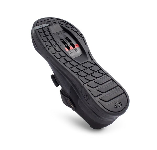 The tread pattern is designed for traction off the bike. Directionally angled and spaced toe and heel lugs offer traction for hiking up or down steep terrain. The ramped toe provides walkability on steep terrain.
